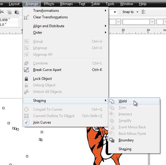En tercer lugar, de "Organizar" menú, ir a "Dar forma" y seleccione "Weld". Esto juntos fusiona todas las capas.