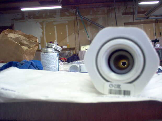 3) este es el paso más crítico en el proceso. Tómese el tiempo para comprender el funcionamiento de la pistola. El interior extremo del barril debe estar al ras de donde el diafragma se encuentra en el extremo de 1 1/2" pies de (E). Para ello, establecer el diafragma en el extremo de (E), manteniéndolo vertical y tornillo en la cámara hasta que quede ajustado, entonces retroceda lo un poco. Todavía con deslizamiento vertical, el cañón hasta que se sienta en la parte superior del diafragma. Esto es donde quiera que consolidó. Marque el lugar donde entra el cañón (E). Eliminar (E) y el diafragma y luego cemento el barril, asegurándose de mantener el extremo centrado en el chambe donde reunirá con el diafragma.