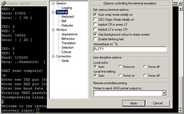 A diferencia de la Jtagulator, la frambuesa Pi 2 terminal va devolver todo lo que escriba. Para que sea más fácil ver lo que estamos haciendo: voy a apagar el eco local. [Foto 1]