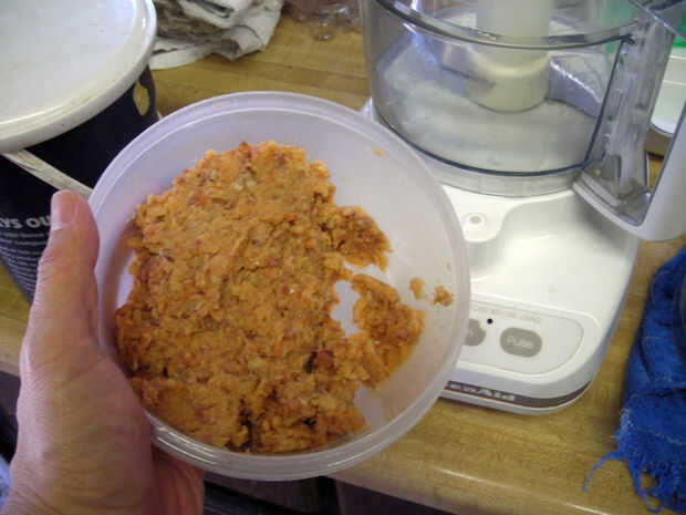 Sacar los extremos de lox, asegúrese de que no hay cartílago o huesos de las piezas poner en un mix master ejecutarlo para unos 20 segundos hasta que el salmón es un tartar de picado de carne consistencia. Poner en un disco de plástico y cubierta, enfriar en el refrigerador durante 20 minutos.