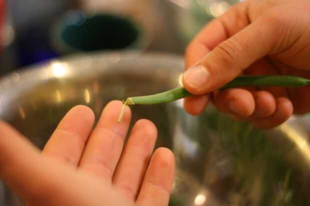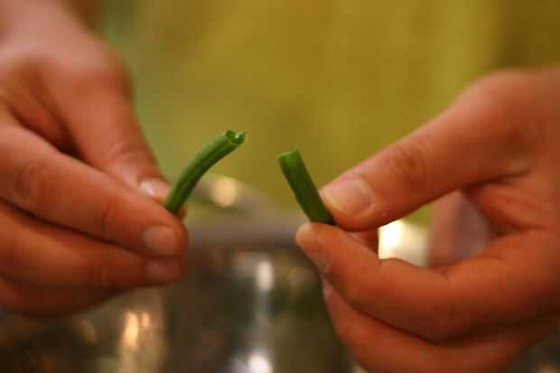 Para preparar los frijoles, los tallos y las puntas de los granos deben cortar, o sacar. Largo verde frijoles también son un poco difíciles de manejar para comer, por lo que es una buena idea para cortar o romper por la mitad.