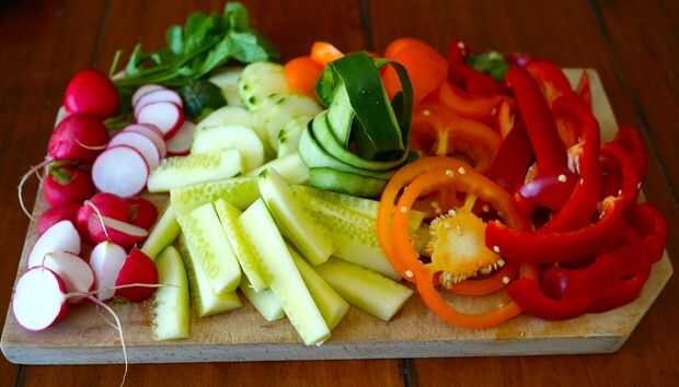 Lavar las verduras, pelar si desea cortar en diferentes formas y tamaños. Por ejemplo, los pepinos se pueden cortar en rondas, bastones y cubos. Incluyen cáscaras comestibles, tallos, hojas y semillas de más formas y texturas.
