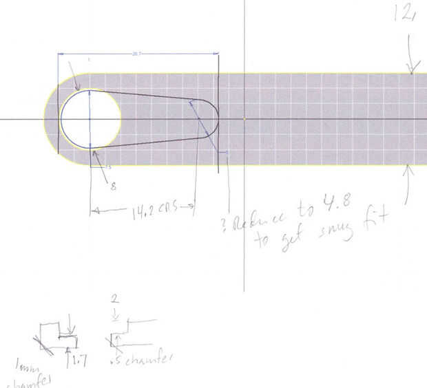 La foto de arriba muestra mi boceto de diseño. La parte es 3,7 mm de espesor. Tiene una hendidura profunda de 2mm para el "brazo" de la bocina y un agujero a través de la sección cilíndrica que se adapta a la spline de servo. La cavidad está formada por dos círculos de 14,2 mm entre centros. El grande es 7,5 mm y el pequeño es 4,8 mm. Hice todo ancho 12mm a 2mm de carne alrededor del agujero grande.