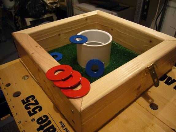 utilizar arandelas de tope de metal 5/8 de pulgada.  Tres alternando tiros por equipo.  Cajas se colocan 25 pies de distancia, centro a centro.  3 puntos para un cuadro. 5 puntos para una taza.  Puntos de opositores cancelan mutuamente.  Copa siempre