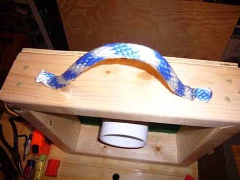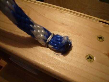 Del clavo de las 2 longitudes de cuerda de nylon con las grapas a los mangos de las cajas.