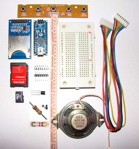 1-Arduino Nano V3.0 (yo usé la versión de chino llamada Funduino Nano). Módulo de la tarjeta de 2 SD. Tarjeta SD 3. Tabla 4-pan. 5 - pulsador de 4. 6 - cuatro resistencias de 22K. 7 - una resistencia de 4,7 K. 8 - BC546B NPN transistor. 9 - altavoces. 10 - cables.
