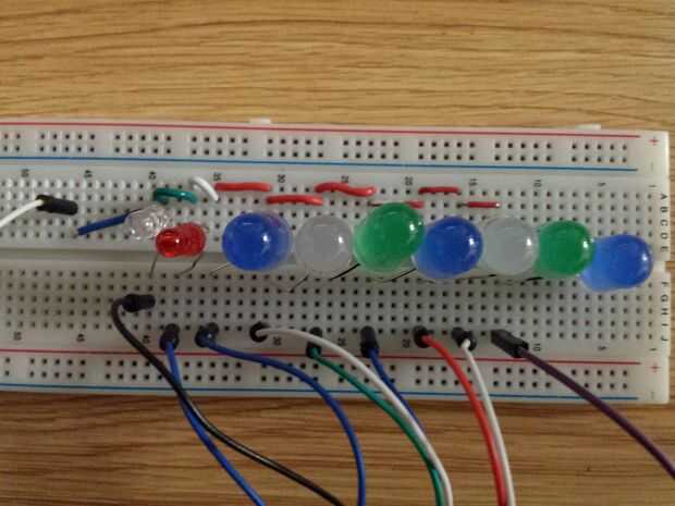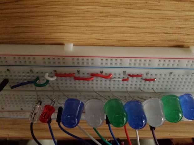 Ahora, inserte todos los cables negativos (generalmente el cable más corto) para todos pero uno de los LEDs en la misma fila. Hacer lo mismo con los cables de positivo en una fila más abajo. Ahora coloque el LED el LED izquierdo más último en la fila. Ninguno de los conductores debe ser eléctricamente conectado entre sí.