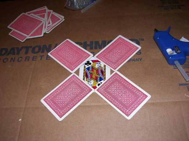 Colocar cuatro cartas en las esquinas de la primera carta, pegamento usando sólo una muy pequeña cantidad de pegamento, esto permite que las tarjetas para moverse lo suficiente como para el recipiente de la forma.