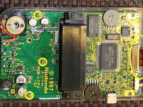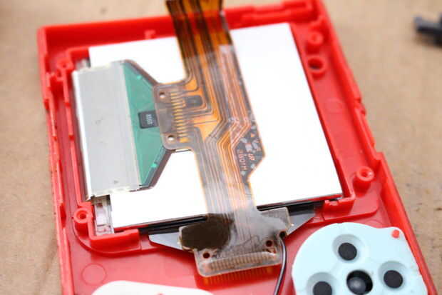 Ahora es un buen momento para limpiar la carcasa frontal con agua y jabón. Déjelo secar. A continuación, frente al PCB, retire los dos tornillos pequeños que fijan el cable de cinta de la pantalla al frente del PCB.