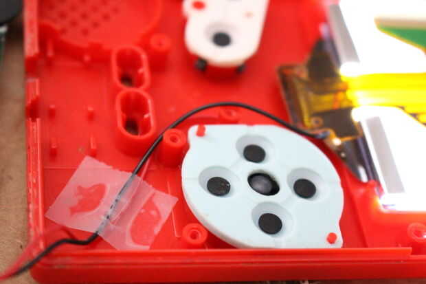 Los cables rojo y negro deben salir del marco y aparecen abajo el cable de cinta en la parte inferior de la pantalla LCD. Les pase por la caja para evitar que los electrodos de botón. Debe aparecer en la parte inferior derecha de la caja. Vuelva a colocar la placa encima de la pantalla cuando esté satisfecho con la colocación de botón y luz de fondo.