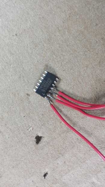 Los 6 cables a la placa de la soldadura y se preparan para soldarlos al chip bivert. Coincidir con los números como se muestra en las fotos. Este paso puede ser difícil de hacer. Estabilizar el chip y utilizar una muy pequeña cantidad de soldadura. No caliente el chip demasiado ya que puede dañarlo. Tenga un pequeño movimiento de cepillado no para conectar los espacios firmemente los pernos.
