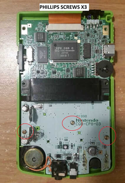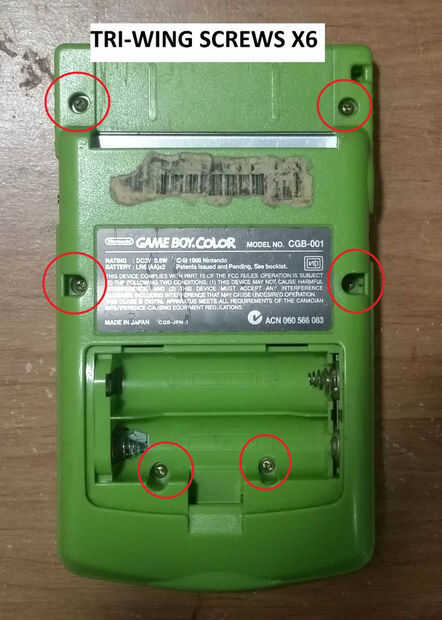 Hay 6 tornillos de tipo tri-ala en el exterior del Gameboy. He rodeado por lo que son fáciles de identificar.
