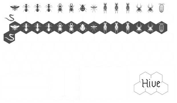 Aquí está el archivo de vector que utiliza. He realizado con Inkscape, incluye todas las piezas originales además de las tres extensiones oficiales (Mosquito, Mariquita y Tenebrio) y un extra comunitario, la lombriz. Hay hexágonos adicionales para ser pegados juntos para dar un buen pedazo en la mano. También se incluyen las piezas necesarias para la caja.