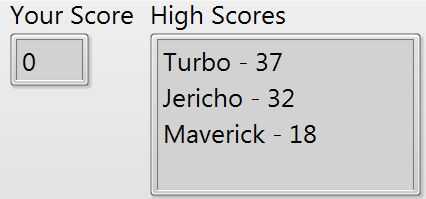 Foto de arriba es el diagrama del panel y el bloque frente para la puntuación más alta juegos serpiente. Cuando un juego es terminado, la calificación es enviada a través del cable USB conectado a un uC32 y leer en LabVIEW utilizando la VISA Lea función. La estructura case se asegura que hay bytes disponibles en la conexión en serie antes de leer. El código utiliza una escritura serial que solo envía el valor decimal real a través de la línea serie en un byte. Durante el juego, escribe serial contiene un "1" y luego la longitud de la serpiente. Para el caso "1", la puntuación se actualiza continuamente. Después de que el juego es terminado, se envía un "2" y luego la longitud final de la serpiente. Para el caso "2", se muestra el resultado final y si es un puntaje alto, se solicitará al usuario que escriba su nombre y se actualizarán los puntajes.