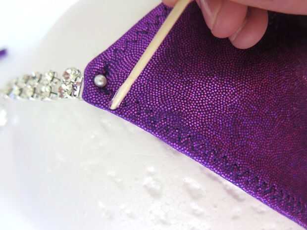 Sumergir un extremo de un palillo del pegamento E6000 y luego "punto" en la tela donde desea un diamante de imitación. El pegamento seca perfectamente claro y no notarse desde el escenario, así que no te preocupes si hay algún exceso.