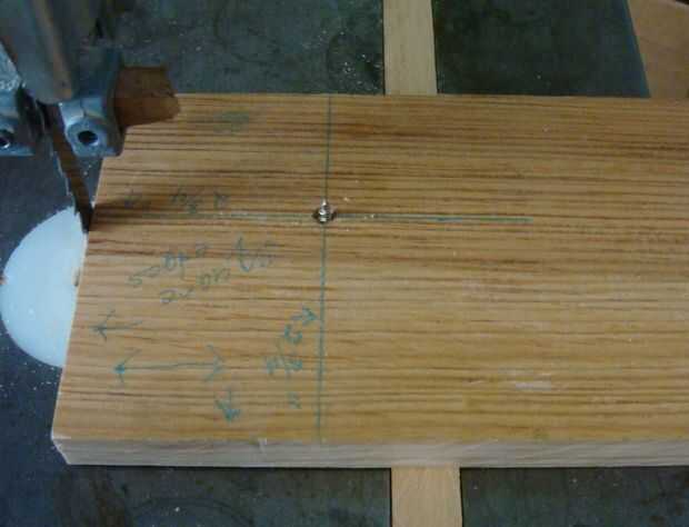 Ahora coloque la pieza de plantilla con el clavo en ella, en la Sierra de banda. Línea hacia arriba para que la línea quede al ras con la parte delantera de la hoja y el pegamento en la pieza. Una vez que sepa donde las piezas se acoplarán entre sí puede cuidadosamente levántela de la sierra y afiáncela con abrazadera juntos.