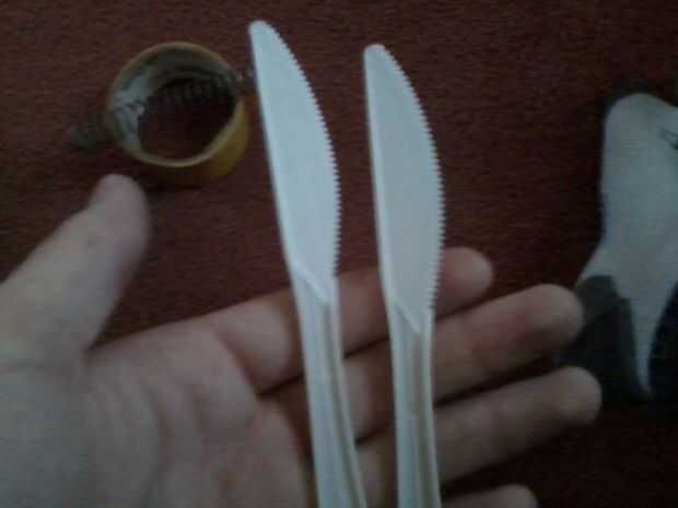 Ahora toma sus cuchillos de plástico y corte los extremos de como se muestra en la imagen. Luego tomar los extremos de la hoja de ambos y se les superponen como se muestra en la segunda foto. Luego la cinta o encolarlos y caliente el fondo suficientemente grande con cinta adhesiva para que quede en el agujero de la carcasa de la hoja (parte pequeña del sostenedor de papel higiénico).