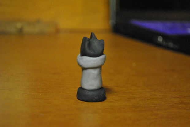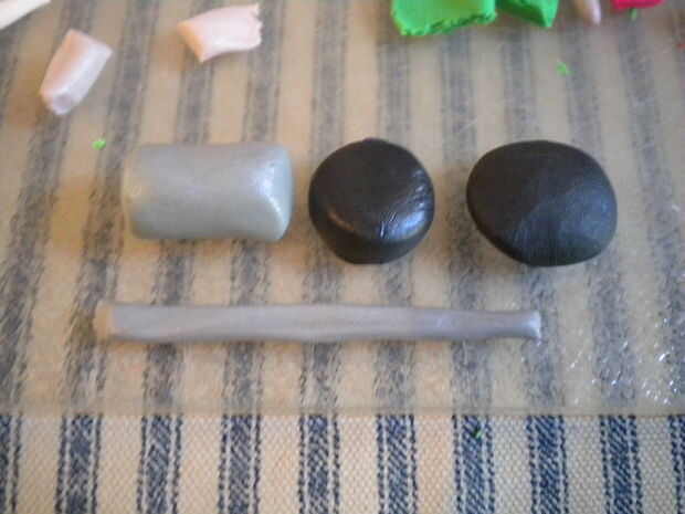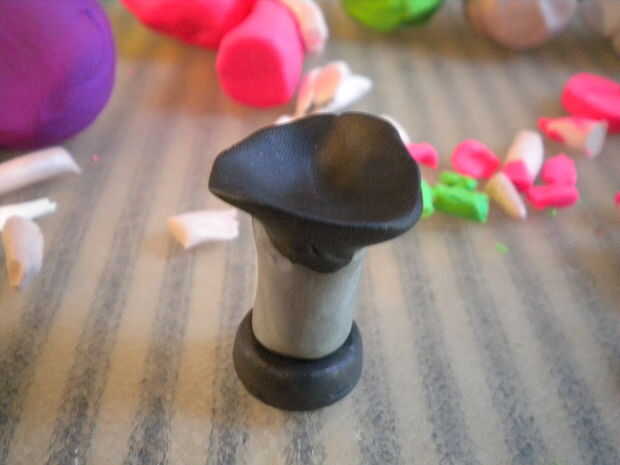 Para hacer el castillo, utilice la tapa de la botella para hacer la base de una negra en aproximadamente 1/4" de espesor. Rodar hacia fuera un tronco, al igual que para el tubo verde. Una franja gris de arcilla que es 1/4" de espesor y la longitud de la circunferencia del tronco son también necesario. También, tome un pedazo de arcilla y moldearla en forma de disco que es aproximadamente 1/2 "x 1/2" x 1/4" y colóquelo en la parte superior del castillo. Este pedazo de arcilla, una vez moldeado en la parte superior, puede ser aplanado hacia fuera en un cuadrado redondeado, luego doblar las esquinas en la parte superior y apriete los lados para hacer una torre del castillo. Finalmente, tomar la tira gris y envuélvalo alrededor del tronco, justo debajo de la torre negra.
