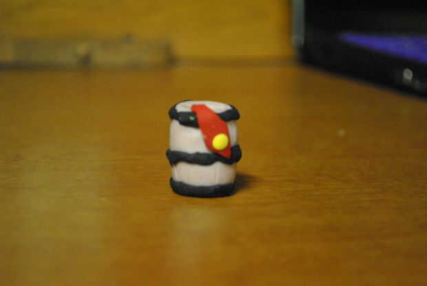 El primer caballero del lado de Zelda y Link es una oda a burro Kong - un barril con una corbata roja colgando de él. Para hacer el cañón, estirar una pieza de barro (preferiblemente marrón, pero utiliza este color para ayudar a contrastar los colores en el tablero), luego papel en forma cilíndrica que sobresale ligeramente en el centro. También, use el pulgar para presionar algunos leves muescas en la parte superior e inferior. A continuación, utiliza pequeñas tiras de barro negro que son la misma longitud que la circunferencia del cañón y enróllelos alrededor del cañón en los tres lugares que se muestra. Para hacer el empate, extraer un pedazo pequeño de arcilla roja y cortar una forma de corbata fina y luego presiona un pequeño trozo de barro amarillo en él (en este pedazo de arcilla amarilla sería las iniciales, DK, pero elijo no hacer aquellos). Por último, hacer algunas líneas en los lados que hacen los lados mirada como tablones de madera.
