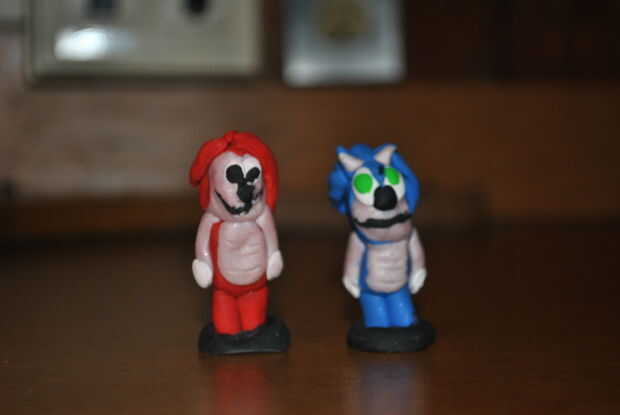 Para hacer los caballeros Sonic y Knuckles, son necesarias algunas piezas base. En primer lugar, desplegar cabezas, pequeños cilindros para los brazos y piernas, formas triangulares largos para la parte posterior de la cabeza y triángulos para las orejas de forma ovalada. Combinar estas piezas juntas para hacer las figuras. Los detalles como ojos, nariz y boca, se puede moldear desde la cabeza oval (que me resulta más difícil) o por el despliegue de estas pequeñas formas y aplicarlas para el óvalo.