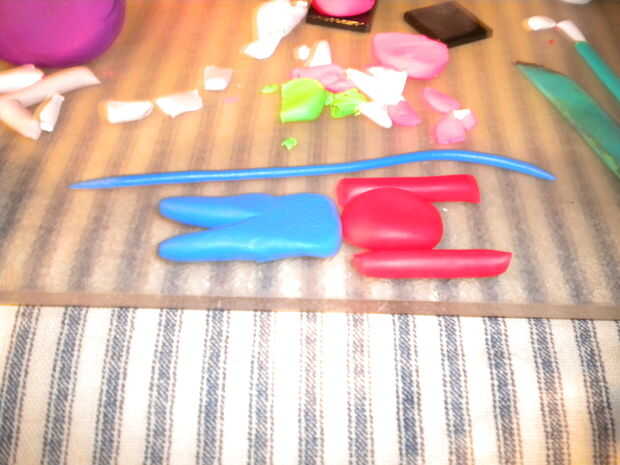 Mario es un proceso un poco más fácil, pero diferente de enlace y las reinas. Las formas generales necesitadas se muestran en la siguiente imagen. Una vez que estas piezas son moldeadas juntos, puede acortarse la tira larga de arcilla para crear los monos y añada puntos de arcilla amarilla para hacer los botones. Para hacer el sombrero, use un pedazo aplanado de barro. Los zapatos en la base son la misma forma para este figura como enlace, la base es los zapatos, solo molde la base marrón en las patas.