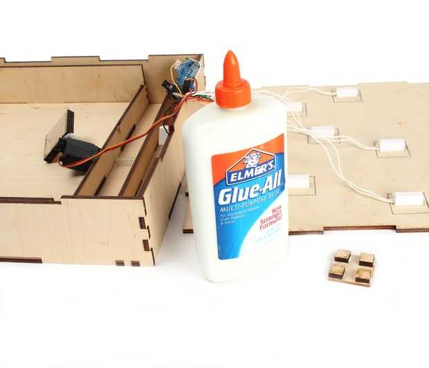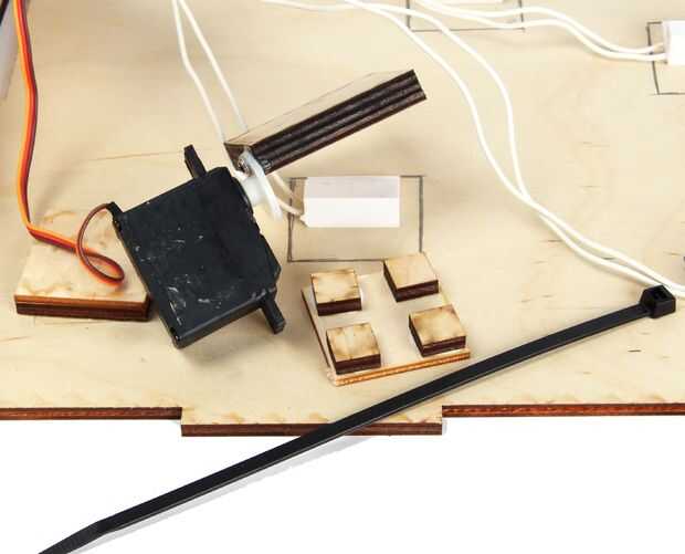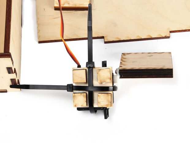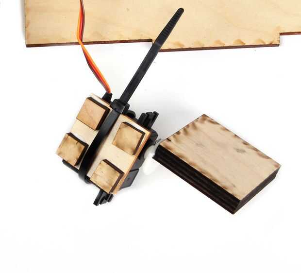 Este montaje de madera atada al servo por ataduras de cremallera en la parte inferior de la parte superior de la placa del pegamento. se debe colocar tal que cuando la palanca está hacia abajo, es el cajón cerrado y al levanta la palanca, recostada contra la parte superior de la caja.