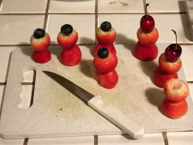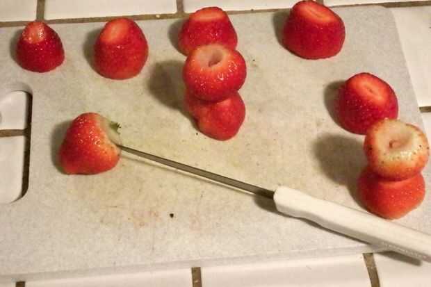 Para los Reyes y reinas tallar hasta algunas fresas. Cortar una forma del cono de la parte superior, quitar el tallo y cortar la parte inferior plana. Asegúrese de que el corte esté a escuadra. Tratar de coincidir las bayas de tamaño similares y corte sus bases en la misma forma para que la pila bien.