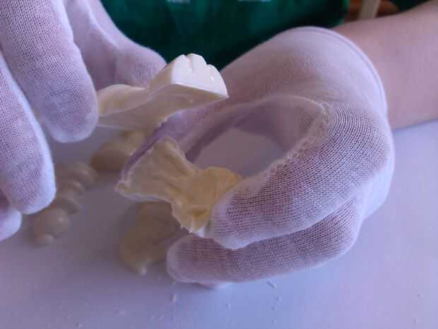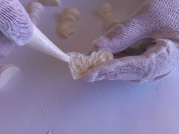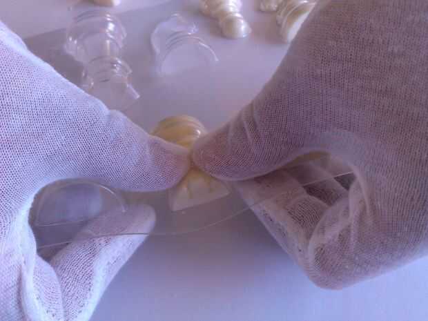 1) uso derretido chocolate como un "pegamento" para unir las dos mitades juntas. Unir las mitades hasta que las piezas se pegan juntas.