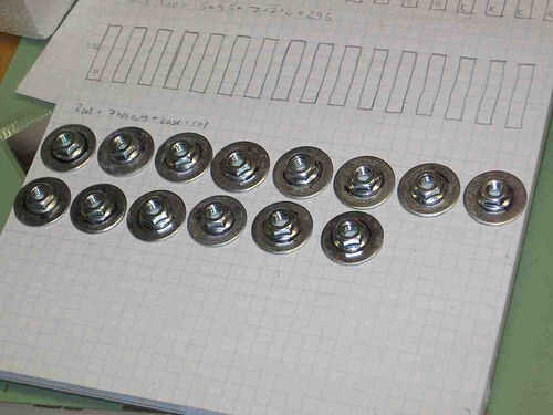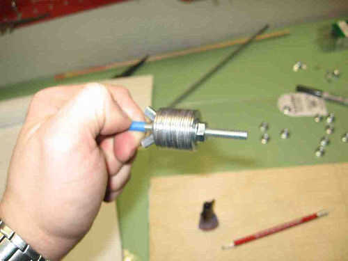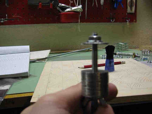 Para asegurarse de que las arandelas y tuercas mínimamente se compensaron entre sí, ideó una solución spiffy: pongo todas las arandelas en un largo 1/4" perno hilo 20 encontré tendido en el taller, con una de las tuercas de mariposa debajo de ellos. Entonces yo le Enrosque una tuerca de brida abajo sobre el perno, aplicar el pegamento, em pegan y - y esto es importante - la pila de la nueva pieza de la base.