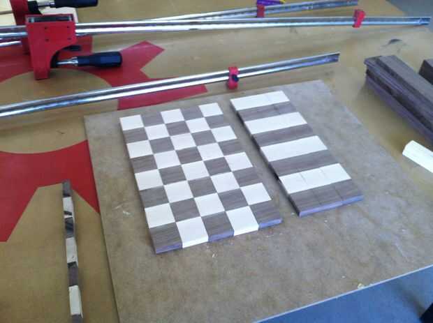 Alternar las piezas para hacer un patrón de tablero de ajedrez. volver a laminar la madera como hecho en el paso dos.  Ser muy cuidadoso para asegurarse de que las piezas alinean.