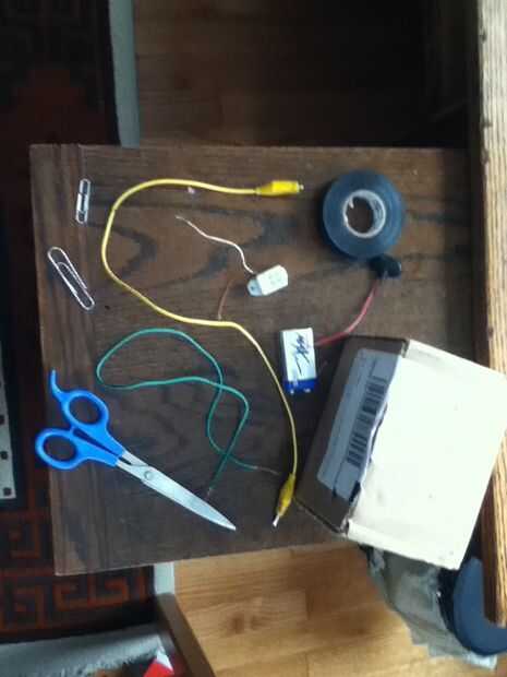 Se necesita: un pequeño clip, un clip de papel grande, alambre, pinzas, cinta aislante, tijeras, peladores de alambre, caja o envase, zumbador, batería de 9 voltios y clip y un interruptor. No pagar nada como las partes que encontré en mi caja de parte.