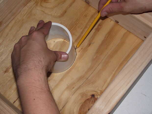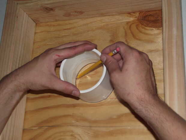 Sosteniendo la Copa caja centrada firmemente en su lugar, utilice un lápiz para trazar los bordes exterior e interior de la Copa, creando un contorno de la copa en el marco de la caja. Nota: La Copa debe tener una pequeña sección en un extremo que es más gruesa que el resto.  Se trata de cuando el producto fue moldeado y corte durante la fabricación. Coloque este fin en la carcasa de la caja. Usted debe ver esta sección más gruesa en el contorno.