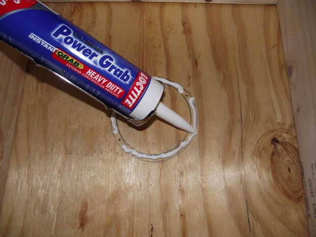 Poner una línea de pegamento en el contorno de la Copa de la caja en el marco de la caja.  Uso adhesivo para construcción que se seque la clara.  No pegue sobre los orificios piloto.