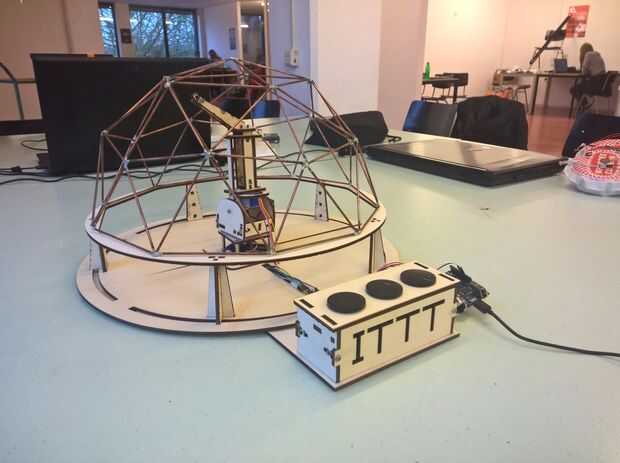 La idea era crear un juego con un brazo de robot que puede ser controlado por tres ruedecillas. Alrededor del robot es una cúpula con varias luces LED que se pueden convertir en independientemente. El objetivo del juego es mover el brazo del robot hacia los LEDs que se encienden. No tengo el tiempo para terminar los LEDs en la cúpula para que también no he completado el juego todavía.