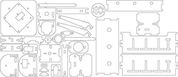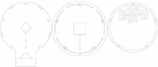 Lo primero que necesita hacer es lasercut todos los elementos. Estos son los archivos para crear las piezas que utilicé para mi prototipo. El robot se basa en este robotarm. Mi versión utiliza un motor paso a paso para la rotación de la parte superior. Se hace de tal manera que la cabeza robotarm es siempre en un mismo distante de la cúpula y usted tendrá que utilizar todas las perillas para llegar a todas las partes de la cúpula. Trata deliberadamente de una forma práctica para crear un robotarm, pero este aumenta la jugabilidad.