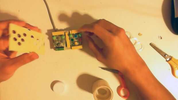 Luego, coloque los botones en posición y arcilla del polímero al horno chatarra o piezas de plástico de la tarjeta para crear separadores que elevarán la placa frontal.