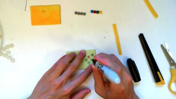 Corta una tarjeta de plástico con el tamaño de la plantilla de papel. Coloque la placa frontal sobre la tarjeta y marca abajo de la ubicación de los botones.
