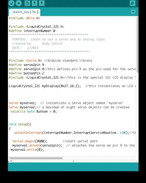 1) empiezo incluyendo mi biblioteca, por lo que puede funcionar correctamente. También puede ver que hay varios define donde defino cada servo para conectar y la pantalla LCD.
