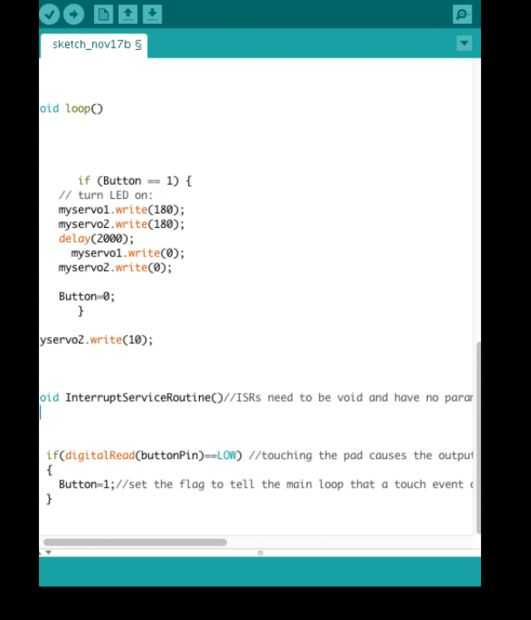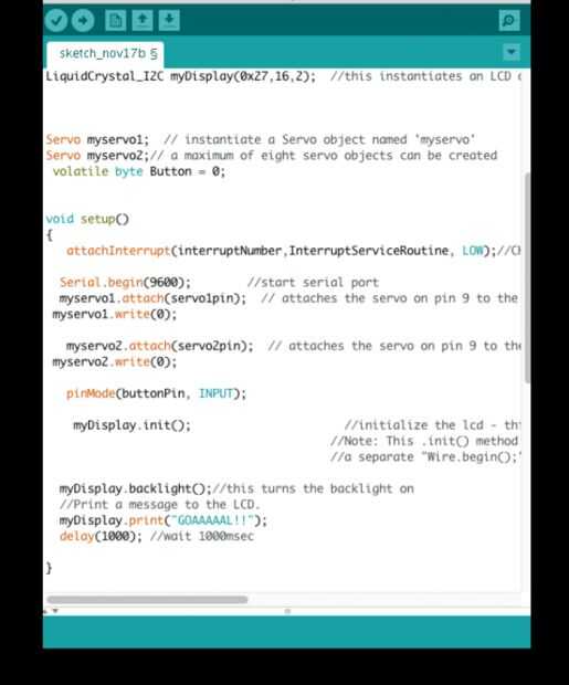 4) mi configuración nula tiene los servos en ángulo cero y aumentan al ángulo 180 cuando se presiona el botón cada vez que se pulsa el botón manos se suben a 180 ° y volver abajo sin embargo desde mi LCD también tengo que imprimir "objetivo" cuando hay un puntaje.