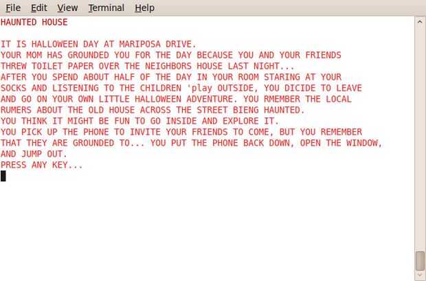 IMPRIMIR "SE EJECUTA A TRAVÉS DE LA CALLE A LA 'CASA EMBRUJADA' A VER QUE LA PUERTA"