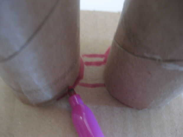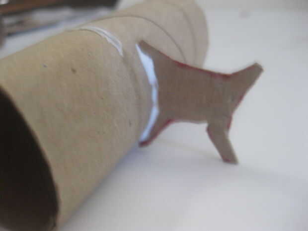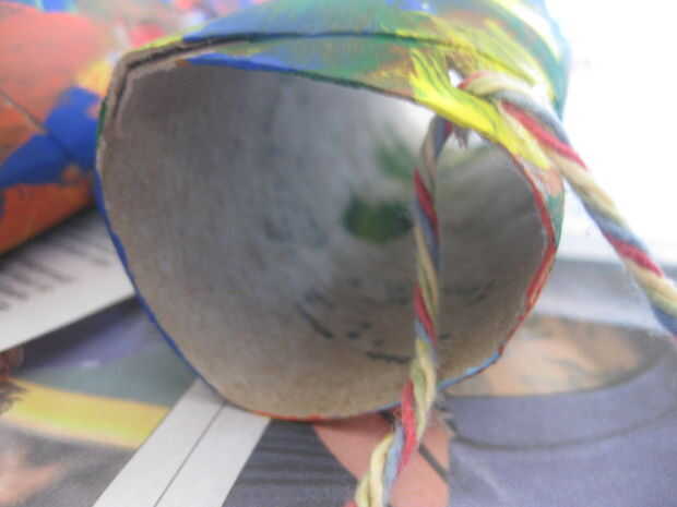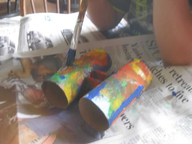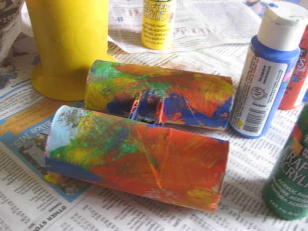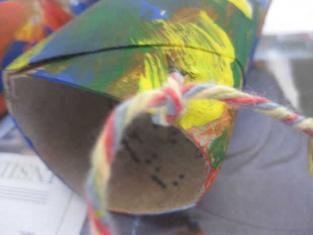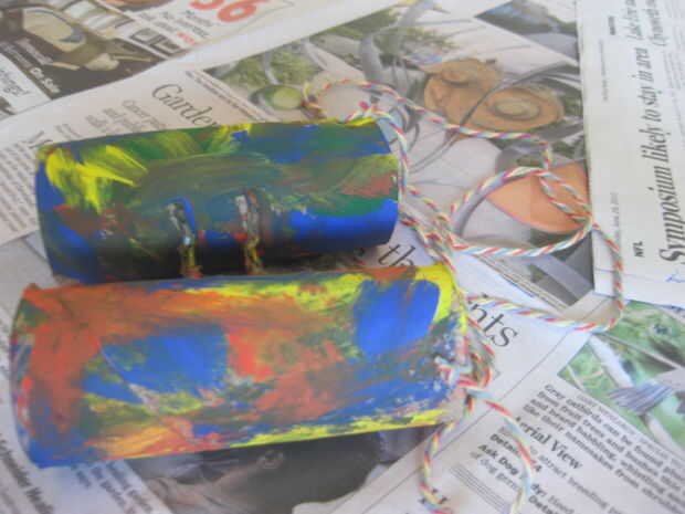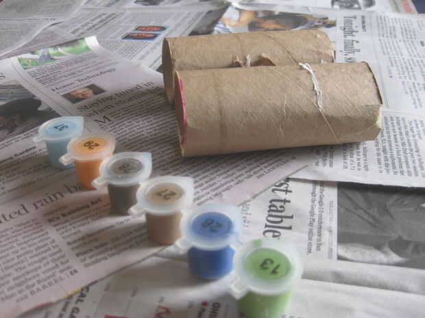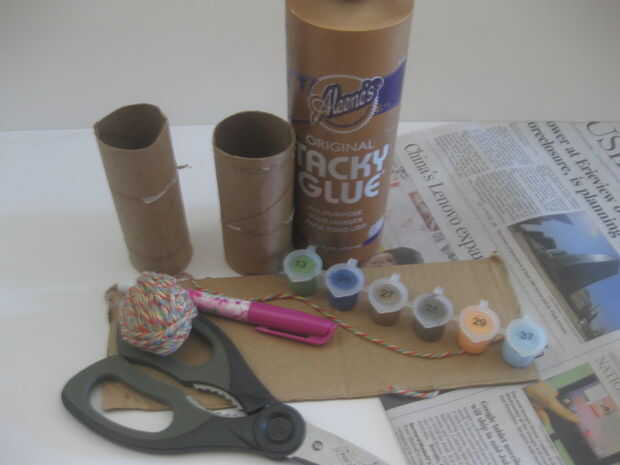 pegamento, pintura, periódico, hilo, marcadores, cartón, dos rollos de papel higiénico interior y tijeras