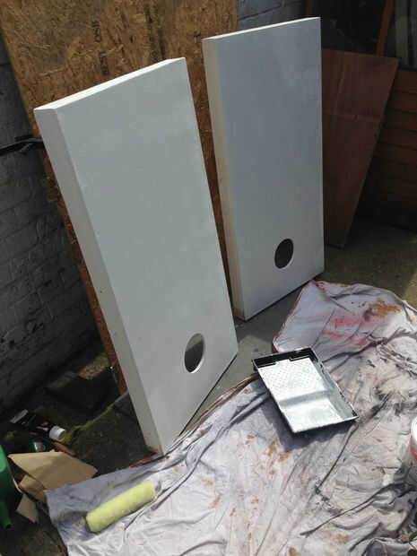primer de relleno tornillo agujeros en el frente y los lados con relleno de madera. una vez que ha secado la masilla lija plana.