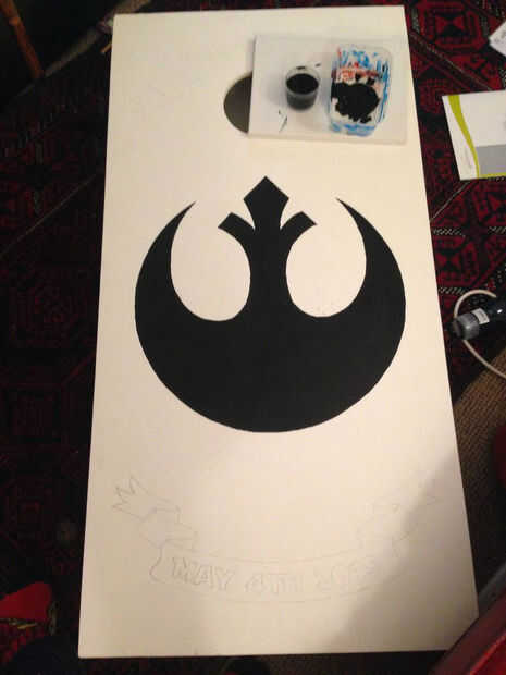 una vez que había esbozado en lápiz llené el símbolo y el texto en negro. Fue una etapa de mucho tiempo, tienes que tener tiempo y tener cuidado y ser tan limpio como sea posible. hice un par de errores (cruce mis manos en un poco de pintura y lo manchado, esto puede corregirse con pintura sobre el error con la imprimación blanca otra vez.)