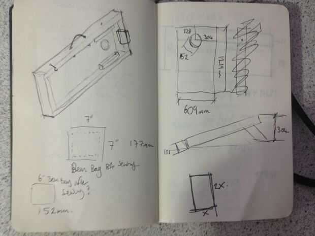 Página 3 de 6 en el libro del bosquejo: dentro de la tabla con el diseño de la muesca de localización. también un pequeño bosquejo de la tela para las bolsas.