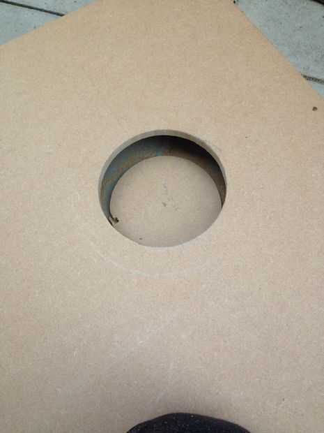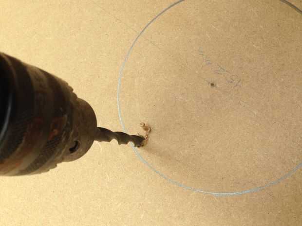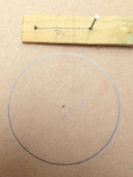una vez que tenga su marca utilizar un compás o hacer un círculo de dibujo de la plantilla como lo hice. el tamaño del orificio necesitado es 152mm hasta la mitad que mida y trace una línea que sobre un poco de madera delgada o tarjeta. poner un clavo en un extremo de la línea y el taladro de un agujero del tamaño correcto para sólo el plomo de un lápiz para empujar a través y allí tienen un círculo de improvisados, herramienta de dibujo. :)