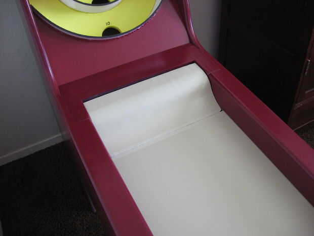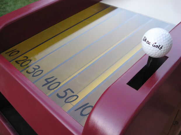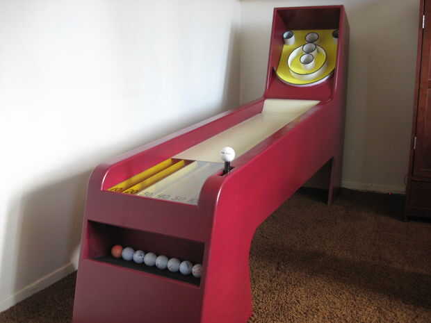 Así que decidí hacer uno. Utiliza bolas de golf y no tiene ninguna electrónica alguna (por diseño). Tiene una bola automática volver sistema que coloca las bolas en los carriles separados para indicar la puntuación de cada bola, que es visible a través de una ventana de plexiglás en la parte inferior de la rampa. Una palanca de caída de bola se estira para lanzar las bolas hacia un compartimento en la parte delantera del juego.