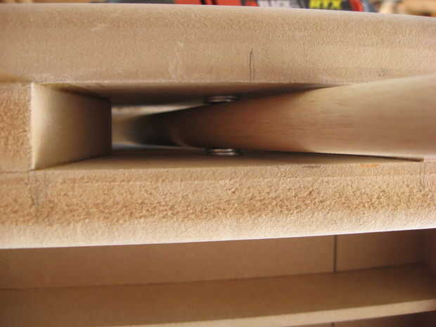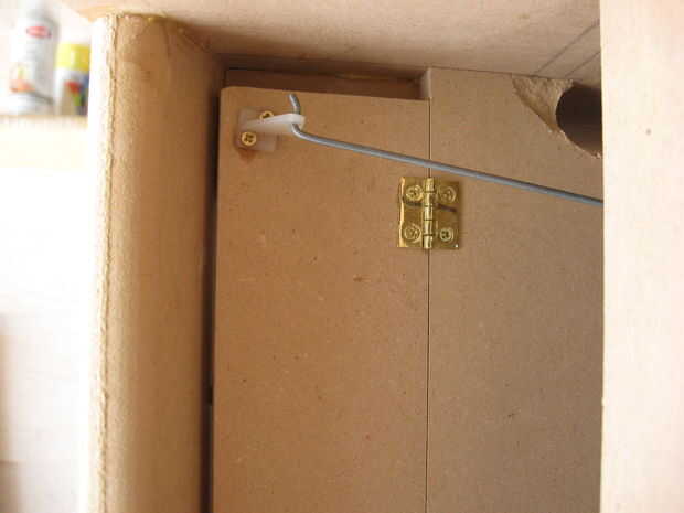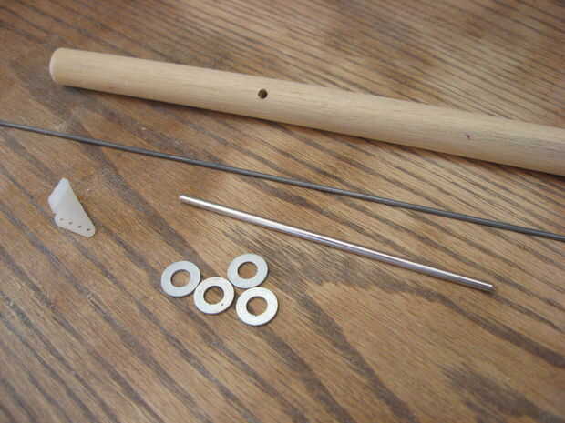 El mecanismo de palanca de caída de bola fue hecho con los pasadores, una sección de varilla fina de metal, arandelas y unos trozos de acoplamiento de avión modelo.