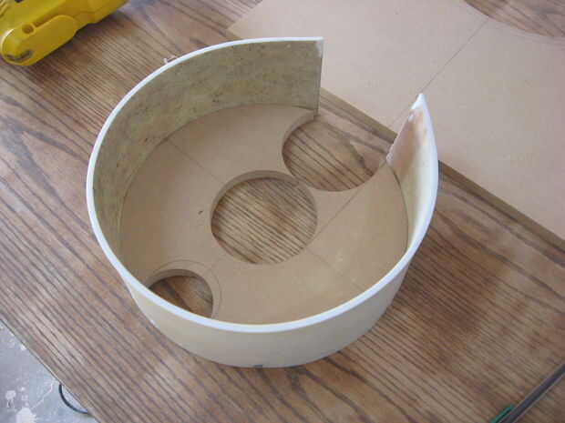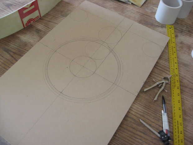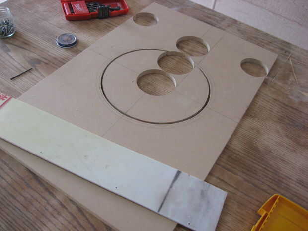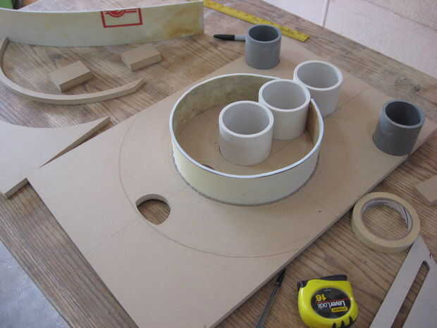 El tablero es de 1/2" MDF. Los agujeros de destino están hechos de PVC. El PVC para los agujeros más grandes es 3 1/2" y los agujeros más pequeños 2 3/4" (diámetro) exterior.