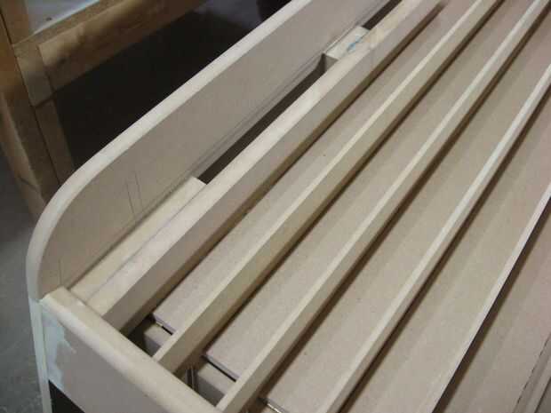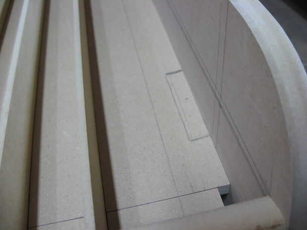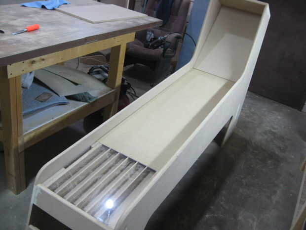 La rampa principal se hace de MDF de 1/4". Las diapositivas en lugar de la parte posterior, encima de pedazos que se agregaron a la rampa de retorno la bola por debajo para soportar la rampa principal y la pieza de plexiglás.