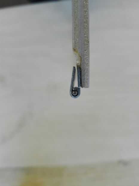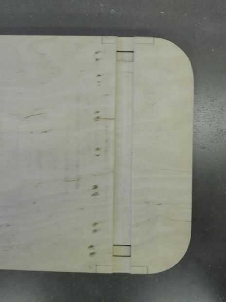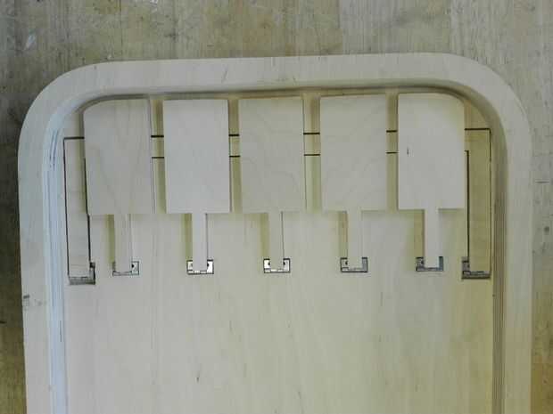 2. presentar una ranura de los extremos de las patas soportes en U, por lo que la bisagra quede alineada cuando pegan (Fig. 5). Esta ranura por lo tanto debe tener el mismo grosor que una bisagra cerrada.